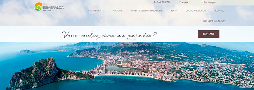 Basée à Calpe sur la Costa Blanca en Espagne, Grupo Esmeralda est une agence immobilière réputée. Sur la page d’accueil du site, la première chose qui saute aux yeux, c’est le moteur de recherche. Et c’est effectivement essentiel : aujourd’hui, les internautes sont toujours plus pressés et veulent avoir une réponse à leur recherche le plus vite possible. En leur donnant la possibilité de renseigner leurs exigences en matière d’emplacement, de type de biens et de prix, Grupo Esmeralda va pouvoir leur apporter un résultat précis.